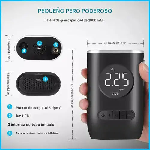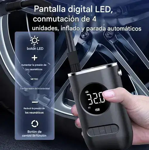 Interfaz fácil de usar:El compresor de aire portátil CarAirPump para neumáticos de automóvil El botón de encendido enciende y apaga la unidad, mientras que el botón de modo le permite cambiar entre diferentes modos de inflado.Bomba de aire con medidor de presión de neumáticos:el compresor de aire portátil CarAirPump cuenta con un medidor de presión de neumáticos incorporado que le permite monitorear el nivel de presión de sus neumáticos y ajustarlo según sea necesario.