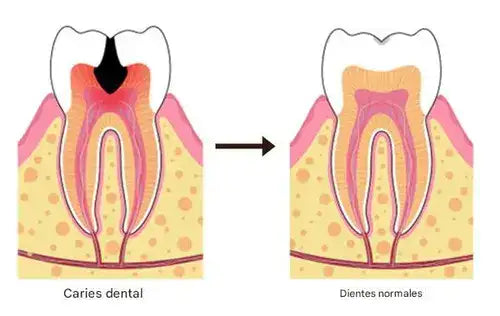 Ayuda a eliminar las bacterias que causan caries y estimula el tejido gingival para promover la regeneración de la dentina. En casos de caries avanzadas, favorece la recuperación del tejido y puede ayudar a fortalecer los dientes debilitados.