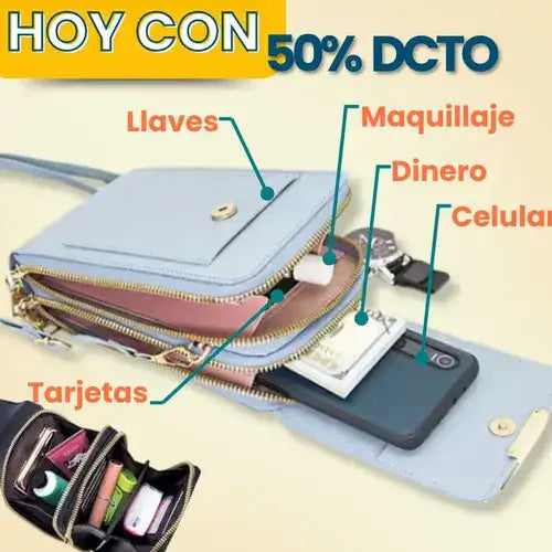 Compacto y práctico, con una ventana táctil transparente para que puedas usar tu celular sin sacarlo del bolso.